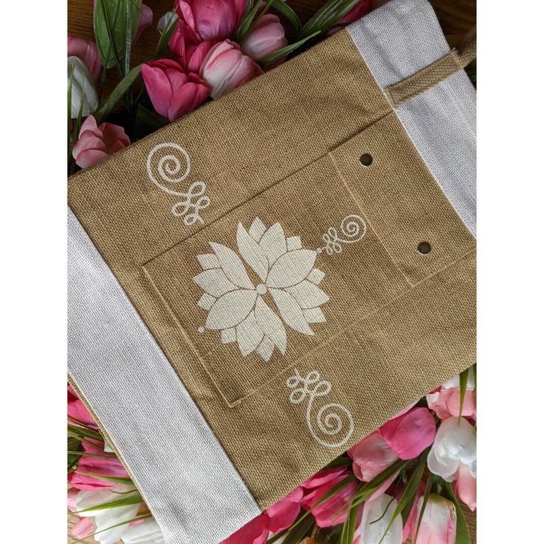 This spiritual tote features Lotus and Unalome — a symbol of enlightenment. Its design is inspired by the spiritual journey I have taken over the last year.